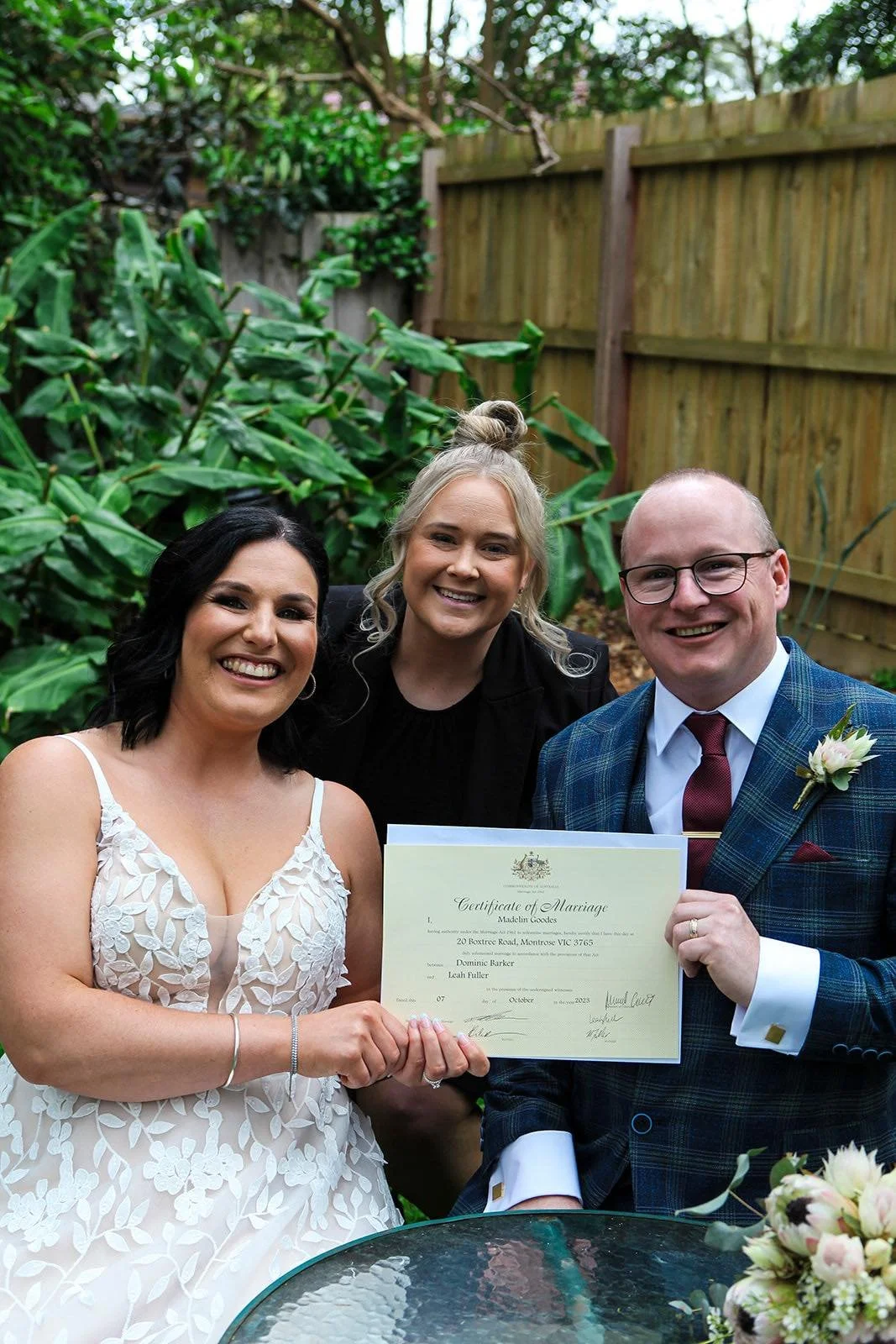 I’ll handle all the official paperwork from start to finish — including your Notice of Intended Marriage, your official certificates, and lodgement with Births, Deaths and Marriages Victoria.